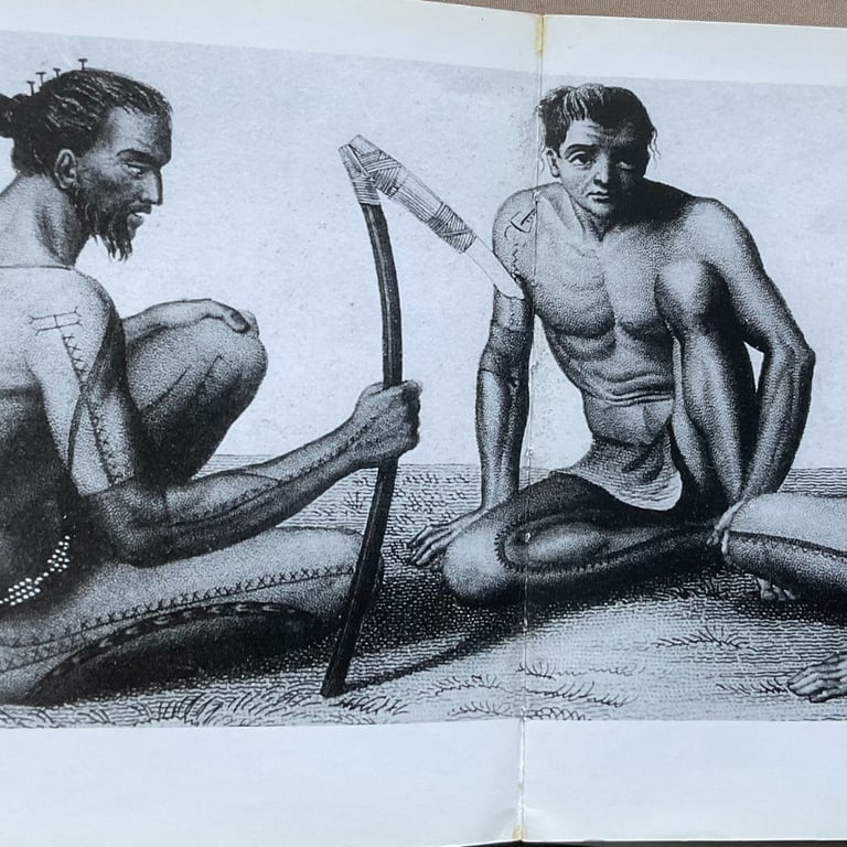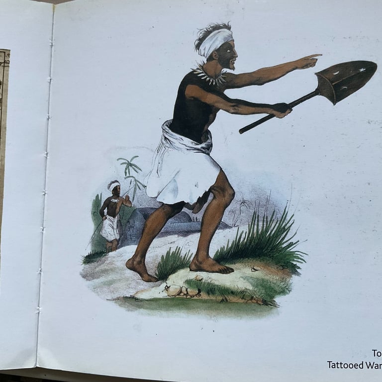 The last documented sketch of a Tongan tatatau was recorded in 1827 during the French Astrolabe expedition led by French naval officer Captain Jules Dumont d’Urville, and published in 1833 by artist Louis Auguste de Sainson. Since that time, the traditional practice of tatatau in Tonga—especially using Samoan ritual tools and ceremony—has not been revived on Tongan soil, despite several individuals of Tongan heritage receiving tatau overseas.